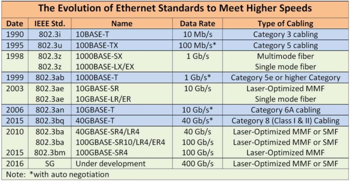 Lo standard Ethernet si è evoluto negli anni per supportare larghezze di banda sempre maggiori (sopratutto per fare competizione alle diverse altre tecnologie che sono state proposte nel tempo, fra cui ad esempio ATM (Asynchronous Transfer Mode). La maggior parte dei cavi che ha supportato nella sua evoluzione sono stati in rame.