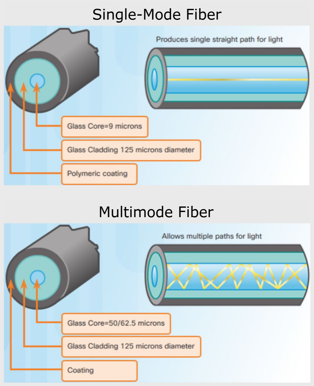 - Single-mode: lo spazio vuoto che conduce il segnale luminoso è molto piccolo (ordine dei 9 micron). Questo permette una grande focalizzazione del segnale, e quindi maggiori distanze di copertura, a costo di velocità ridotte. Per questo motivo vengono usati in link a lunghe distanze (sottomarini, inter-city);