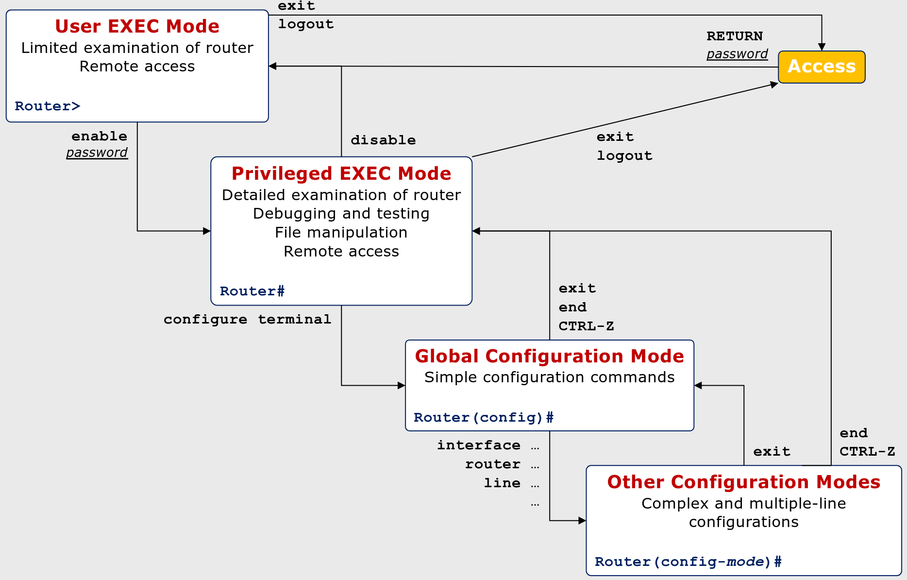 L’interfaccia a riga di comando di IOS è modale: esiste una gerarchia dei comandi disponibili che si articola attraverso categorie di comandi. Questo permette di avere distinzione semantica fra le categorie di comandi, e di spostarsi fra di esse come ci si sposterebbe in un filesystem di un sistema operativo general purpose, o in un menù modale di qualsiasi altro dispositivo: