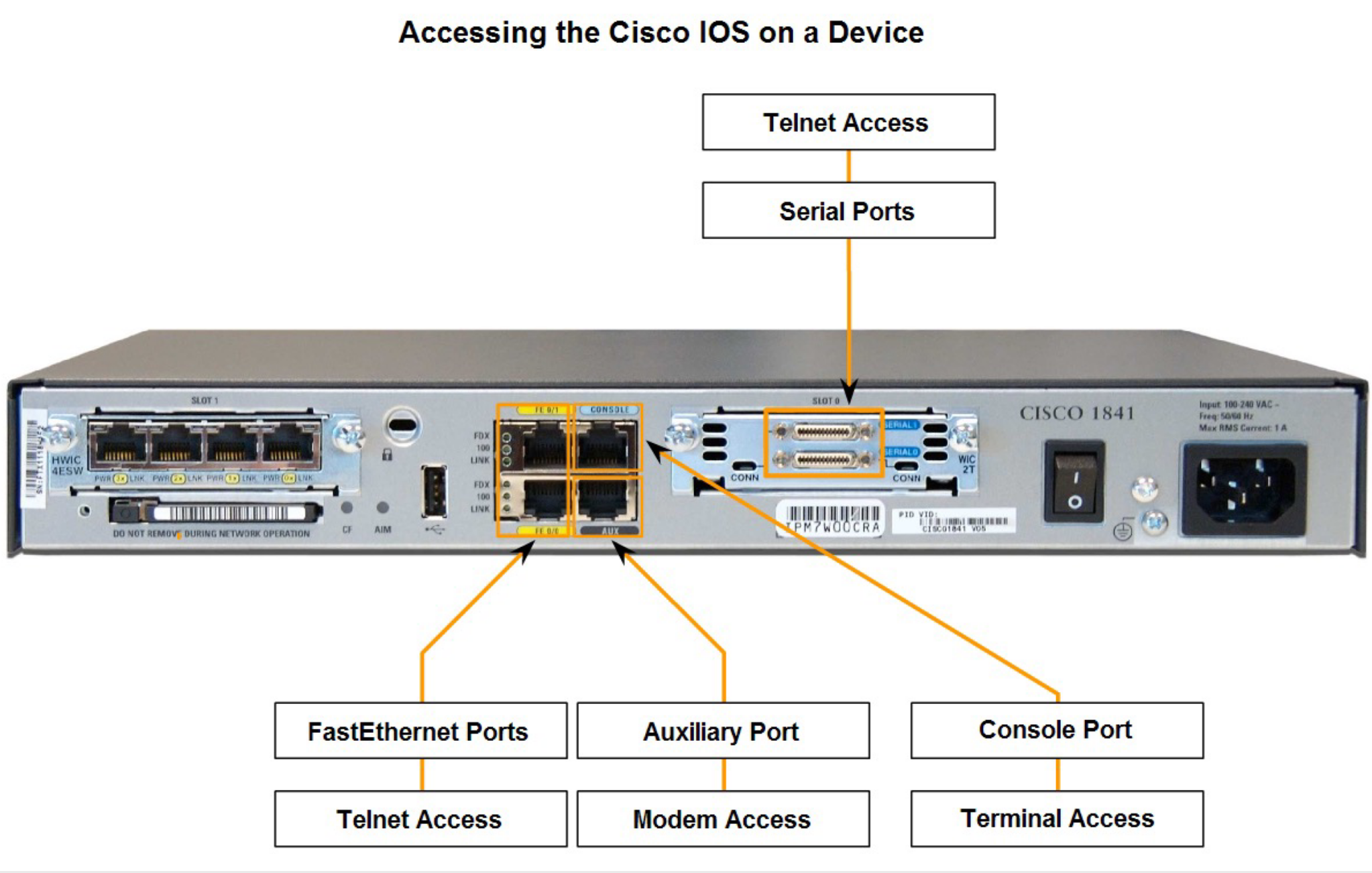 IOS offre un interfaccia a riga di comando, a cui si può accedere via Telnet, SSH (oggi più diffuso) sulla rete locale, attraverso una porta console dedicata, e attraverso alcune modalità legacy (come da modem).