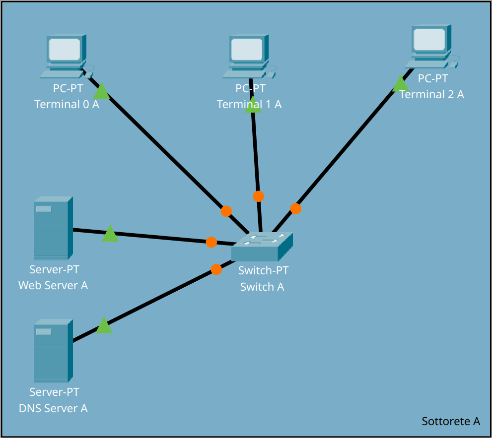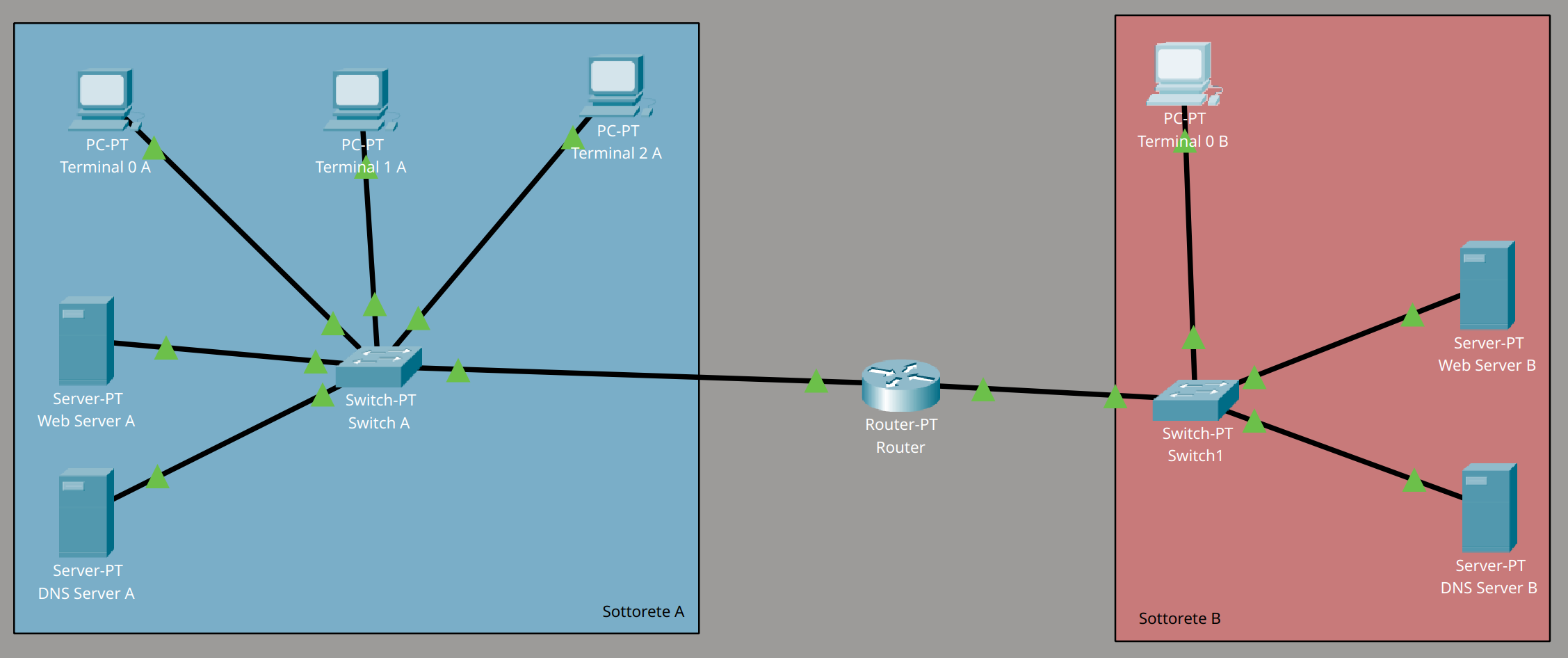 Iniziamo col vedere la prima LAN, costituita da 3 calcolatori (Terminal 0, 1, e 2), uno Web server e un server DNS.