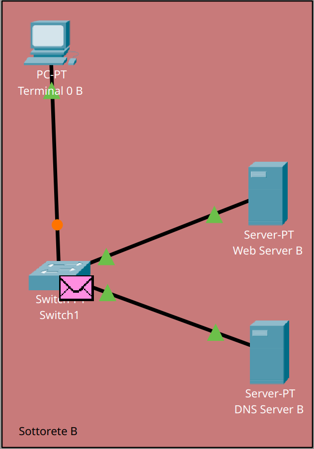 Così è come si presenta la rete all’avvio. I pallini arancioni indicano che le porte dello switch sono bloccate in attesa della scoperta di porte attive dal protocollo STP (Spanning Tree Protocol) in esecuzione sullo Switch. Dopo alcuni secondi, gli indicatori si trasformano in triangoli verdi, che rappresentano che quel link è in stato up (attivo). Di qui in poi lo switch continuerà a mandare pacchetti (quindi sempre STP) per mappare la rete, che non arriveranno a nessun altro switch e quindi verranno scartati.