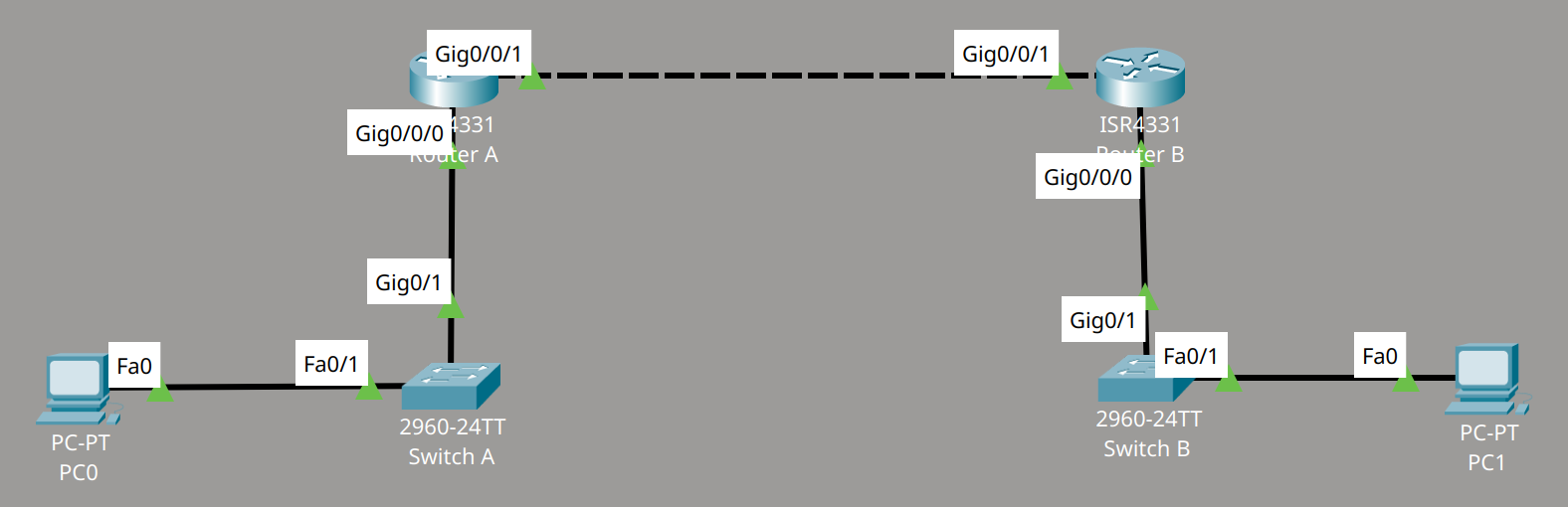 Al momento, se si prova a collegarsi al terminale PC0 a partire dal PC1 (ad esempio con un comando ping) si ha fallimento, in quanto il gateway (cioè il router B) non è capace di trovare un percorso alla sottorete A.